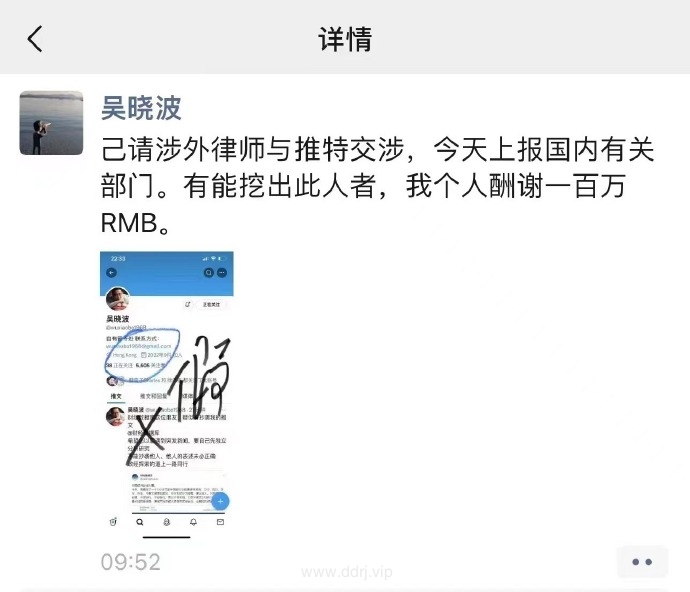 这事有意思,一个资历颇深的专业媒体人,开了一个推特账号,假冒吴晓波,然后说了很多反贼的话。吴晓波的微博被禁言了,哑巴吃黄连有苦说不出。在朋友圈悬赏百万,捉拿这个“李鬼”。