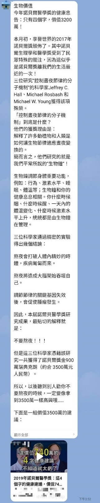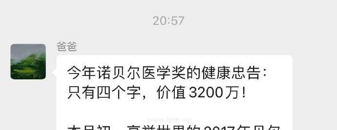 我来为大家解惑了:本届诺尔贝医学奖研究成果,最贴切的解释就是:不要熬夜!!!这话听着一点也不新鲜啊!父母长辈亲朋好友没少叨念过。但是这三位科学家凭借该研究一共获得了诺贝尔奖金900 万瑞典克朗(约合 3500万元人民币)。所以,以后听到别人劝你不要熬夜的时候,一定要像拿到3500万一样高兴哦