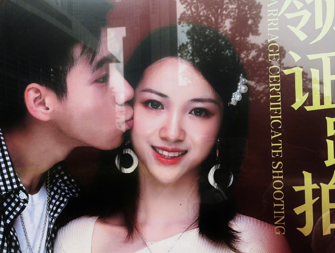 看到一个婚纱摄影的广告……总觉得有点古怪,两个人的表情都微妙地不在状态,没有一个是情愿的。