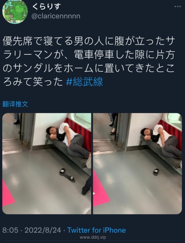 上班族在电车上看到有人霸占优先礼让座位睡觉就怒、乘停车之际将其一只拖鞋放到了月台上……